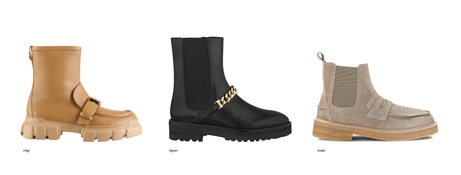 Der Chelsea setzt seine Erfolgsstory fort – als cooler Hybrid aus Bootie und Loafer oder dekoriert mit markanten goldenen Schmuckketten. Die Schafthöhen variieren zwischen knapp über dem Knöchel und wadenhoch. Softe Toffee- und Naturtöne und cleanes Schwarz gehören zu den Farbfavoriten.